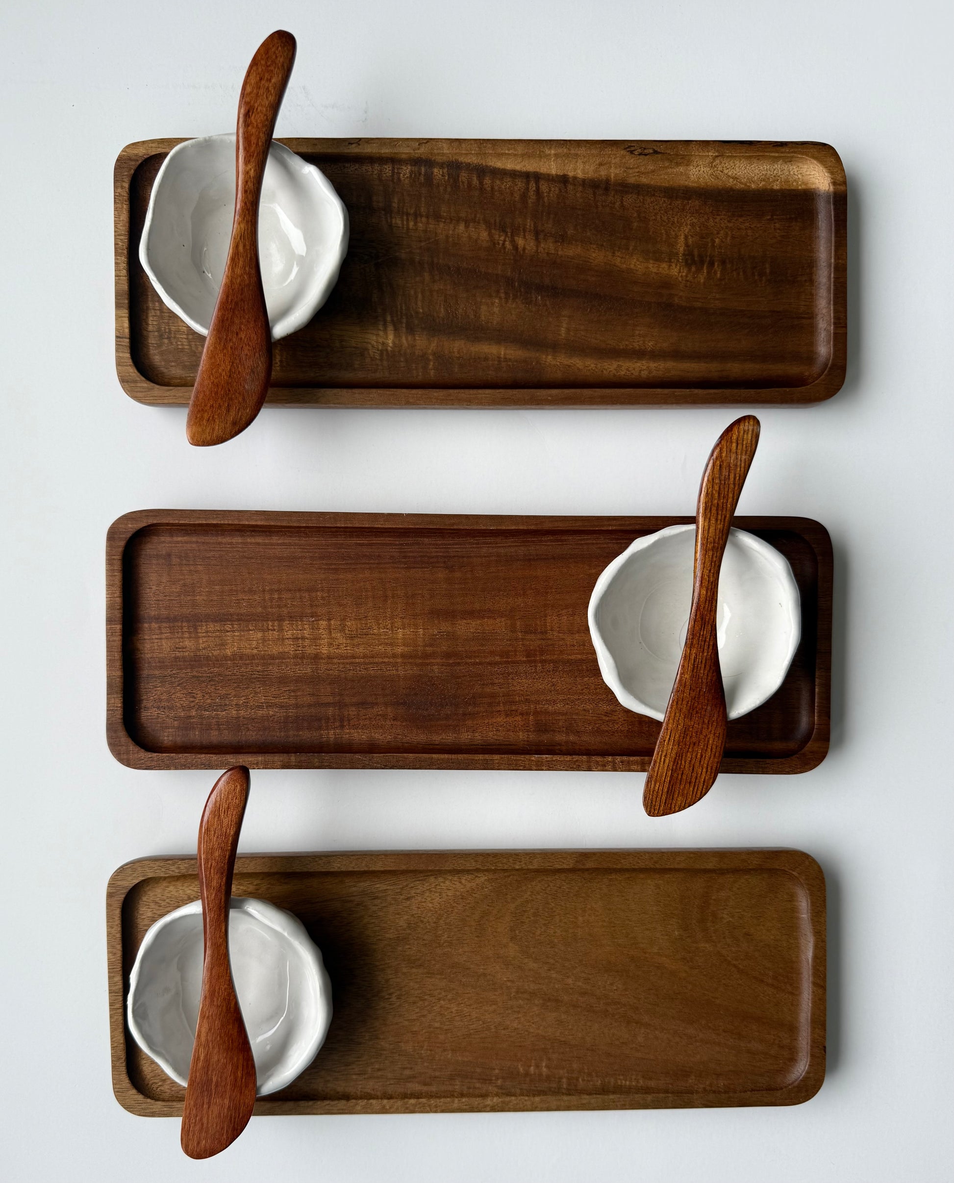 1 stoneware pinch pot, 1 wooden knife and 1 wooden tray.